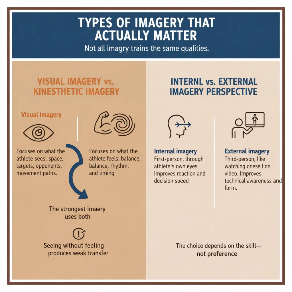 - Visual imagery focuses on what the athlete sees: space, targets, opponents, movement paths.