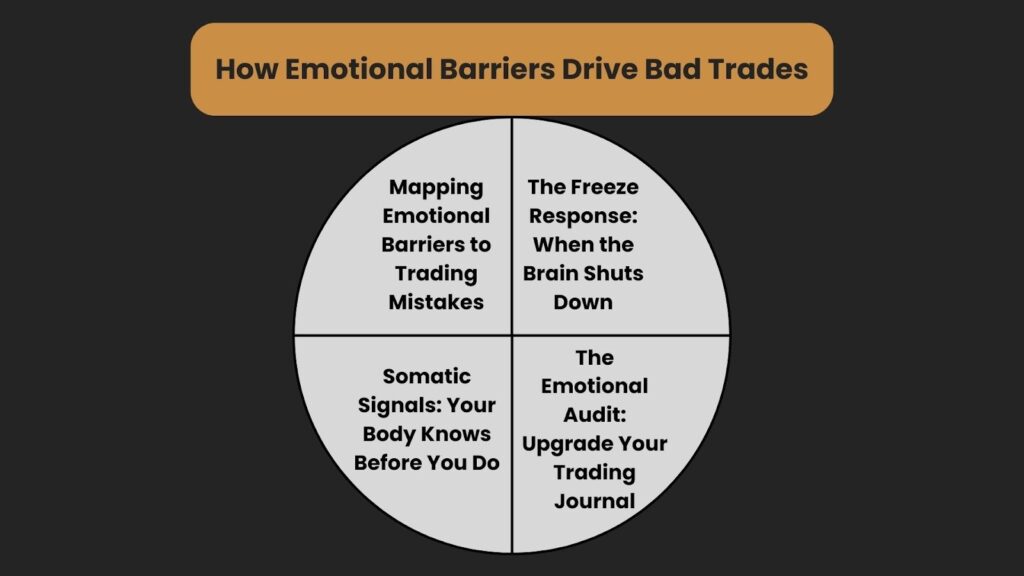 Each emotional barrier maps to a specific, recurring trading mistake and produces an identifiable unconscious signal that appears before the decision is made.